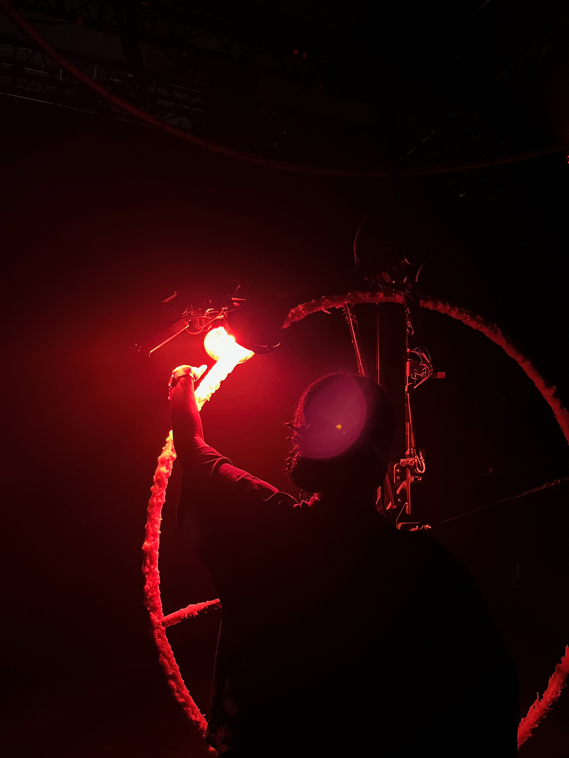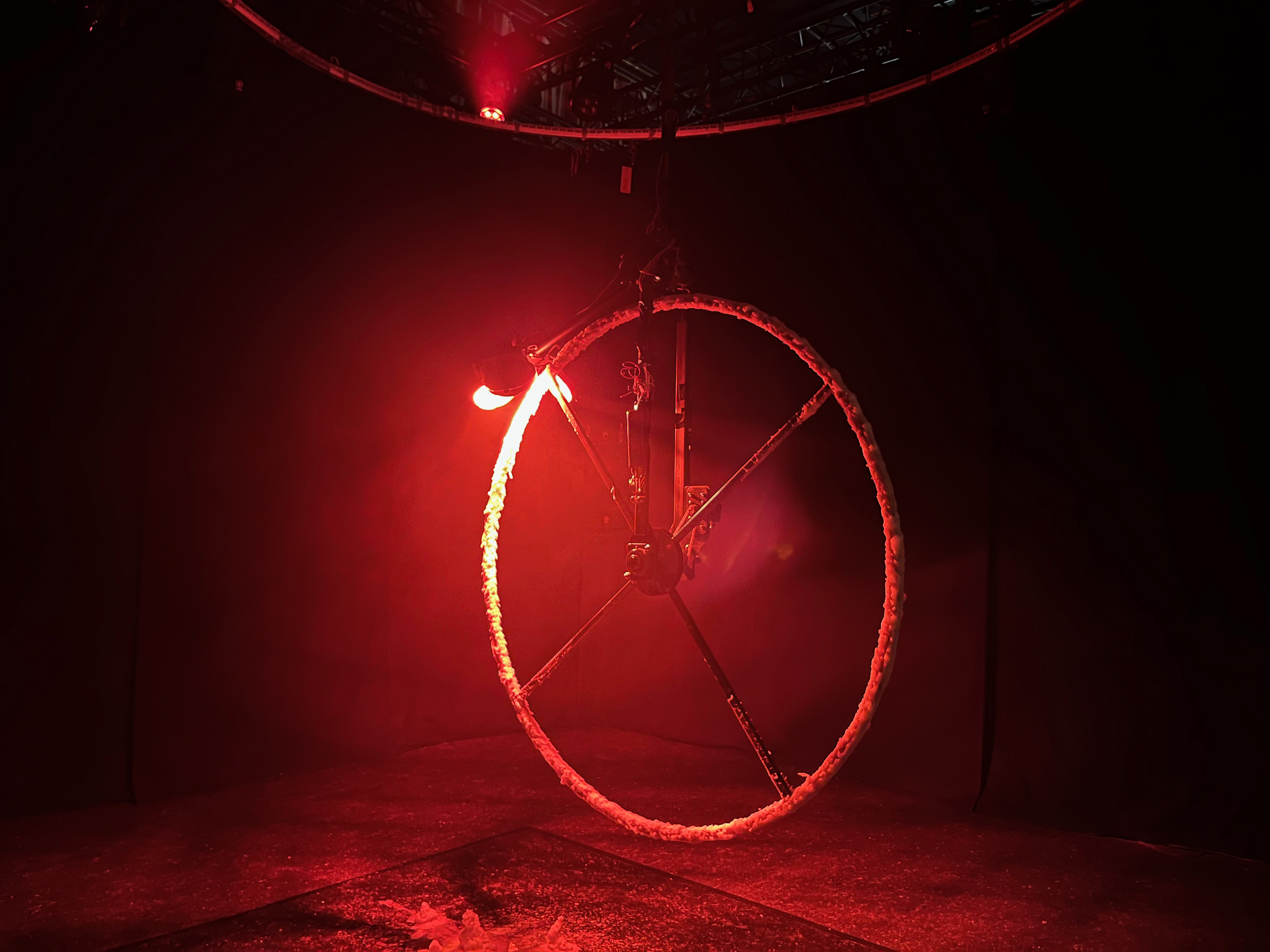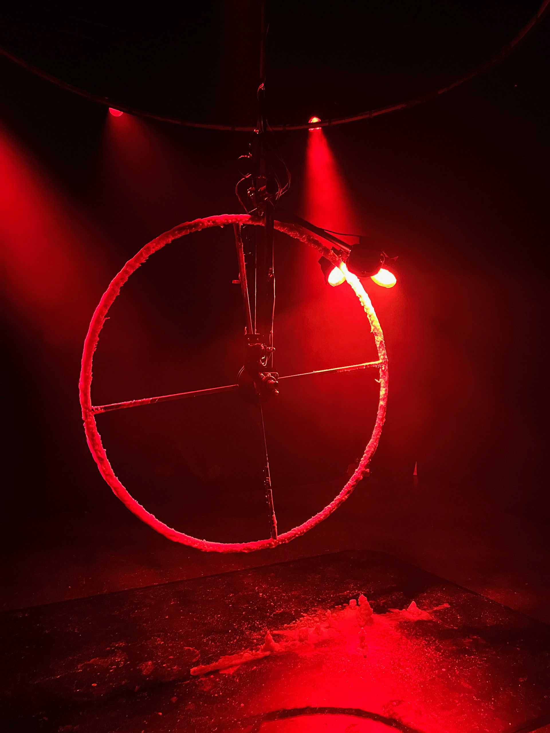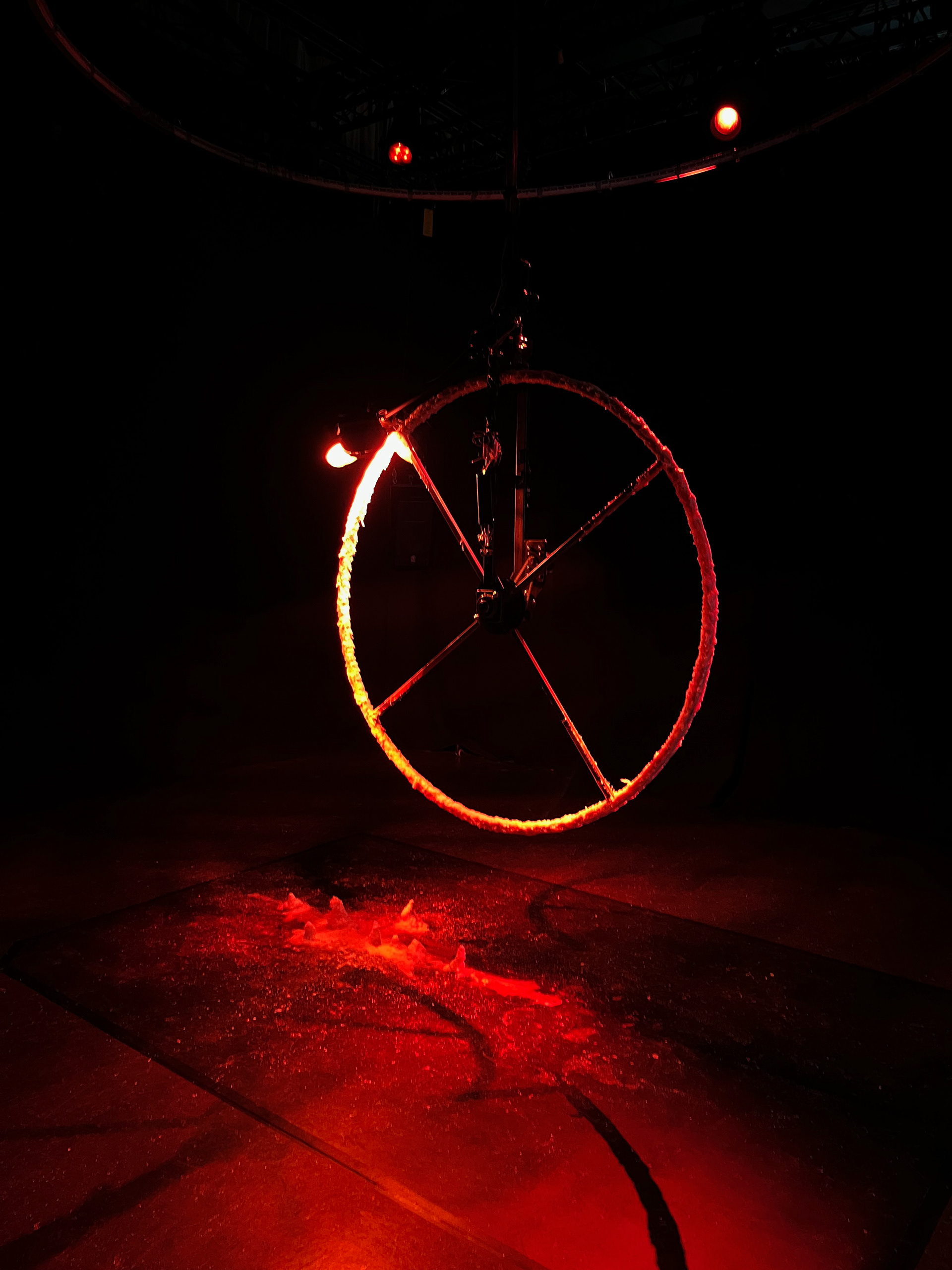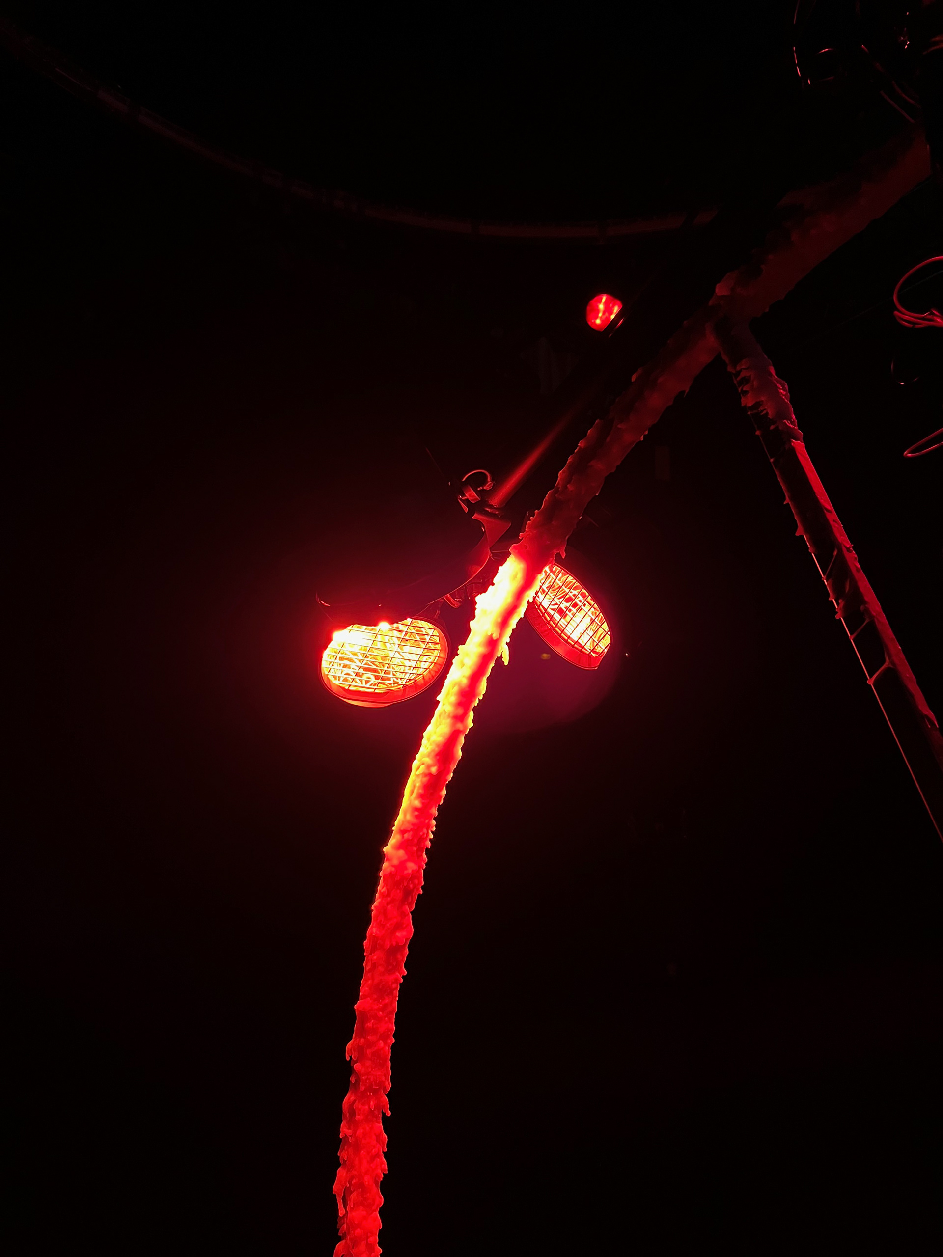 A wheel of wax spinning underneath a heat lamp, melting and re-hardening, under the soft drone of a voice installation and surrounded by a warm, dark space reminiscent of the Earth’s core, invites the audience to consider deep time and how Earth is a living being just like us, constantly changing.